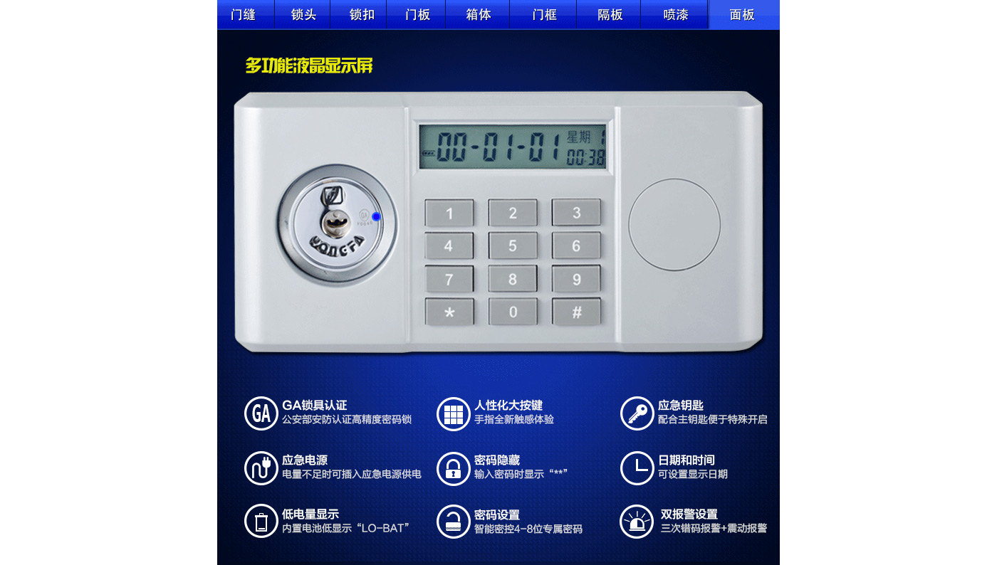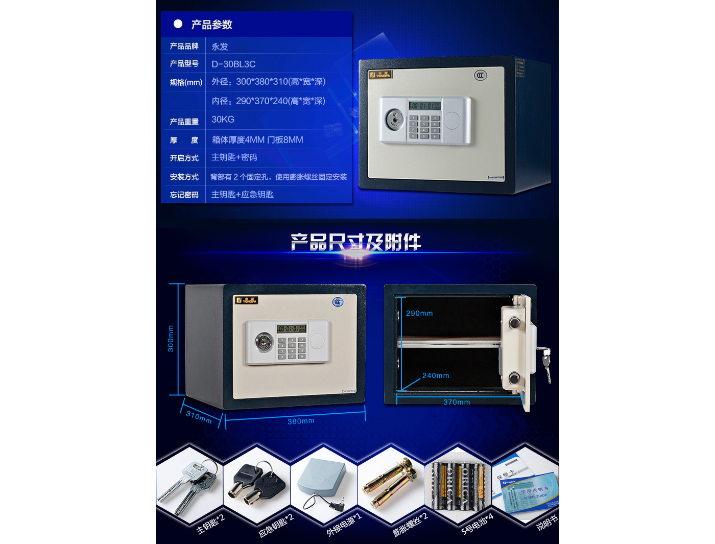 永發經典電子系列3C認證保險箱D-30BL3C尺寸說明:300高*380寬*310深mm 重量:30kg