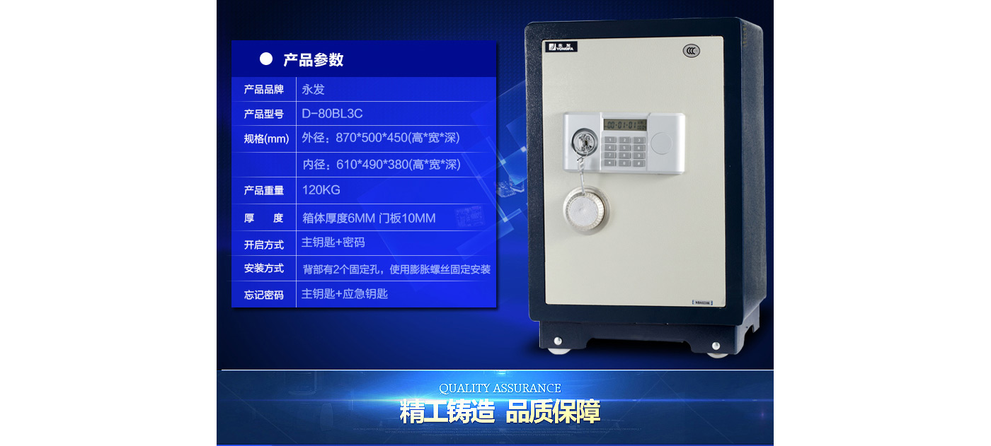 永發經典電子系列3C認證保險箱D-80BL3C尺寸說明:870高*500寬*450深mm(含底座) 重量:120kg