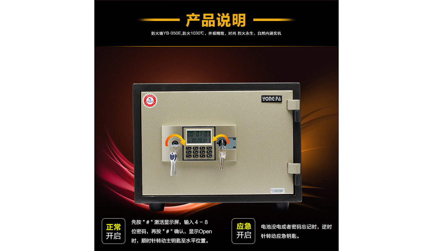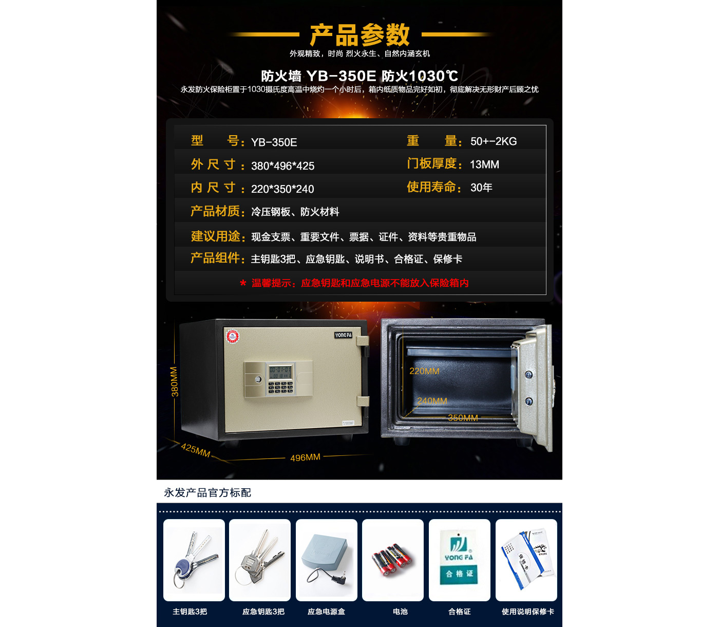 永發電子防火柜YB-350E尺寸說明:380高*496寬*425深mm 重量:50kg