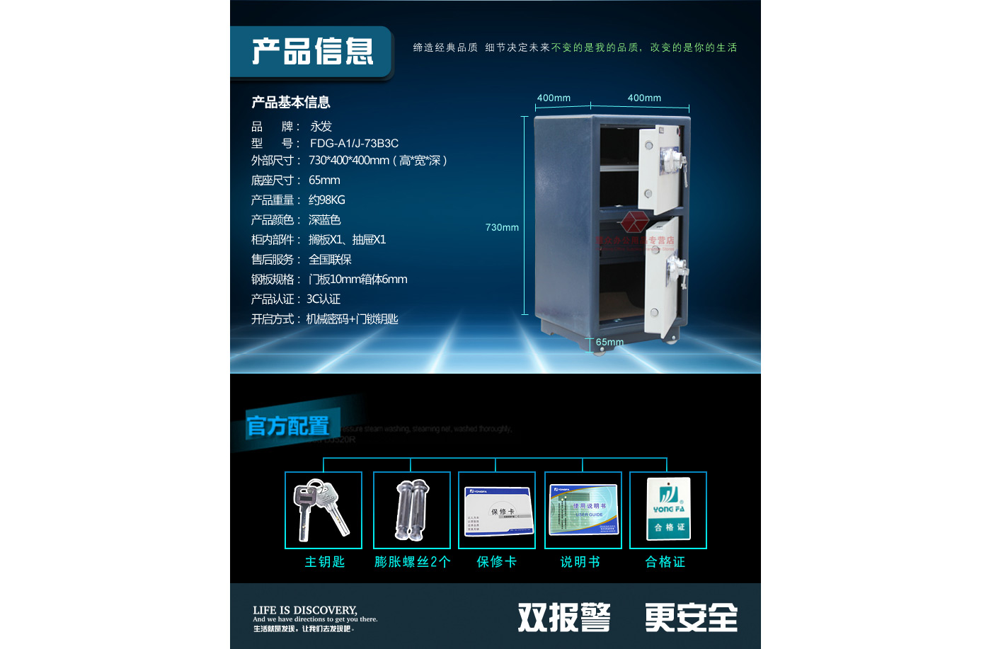 永發(fā)經(jīng)典機械系列3C認證保險箱J-73B3C/d尺寸說明:800高*400寬*400深mm(含底座) 重量:96kg