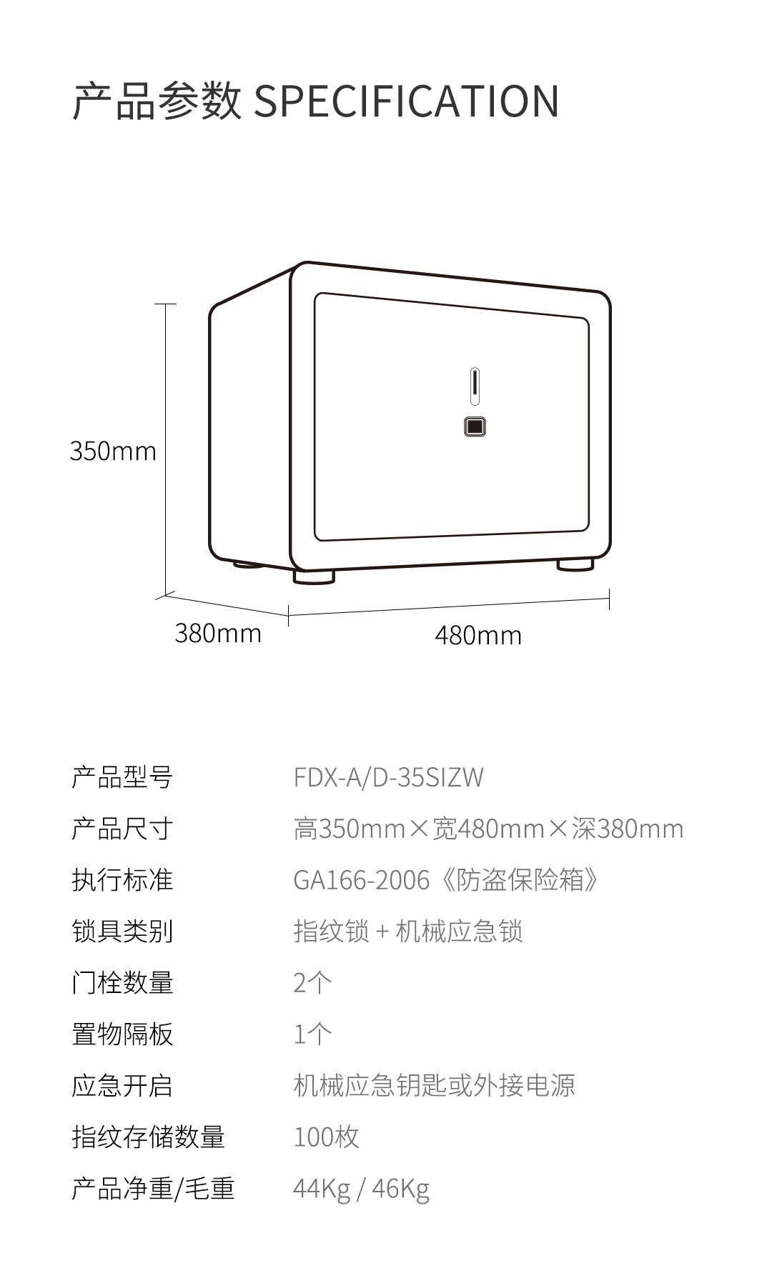 卡嘜安諾指紋系列3C認證保險箱D-35SIZW尺寸說明:350高*480寬*380深mm(含底座) 重量:46kg